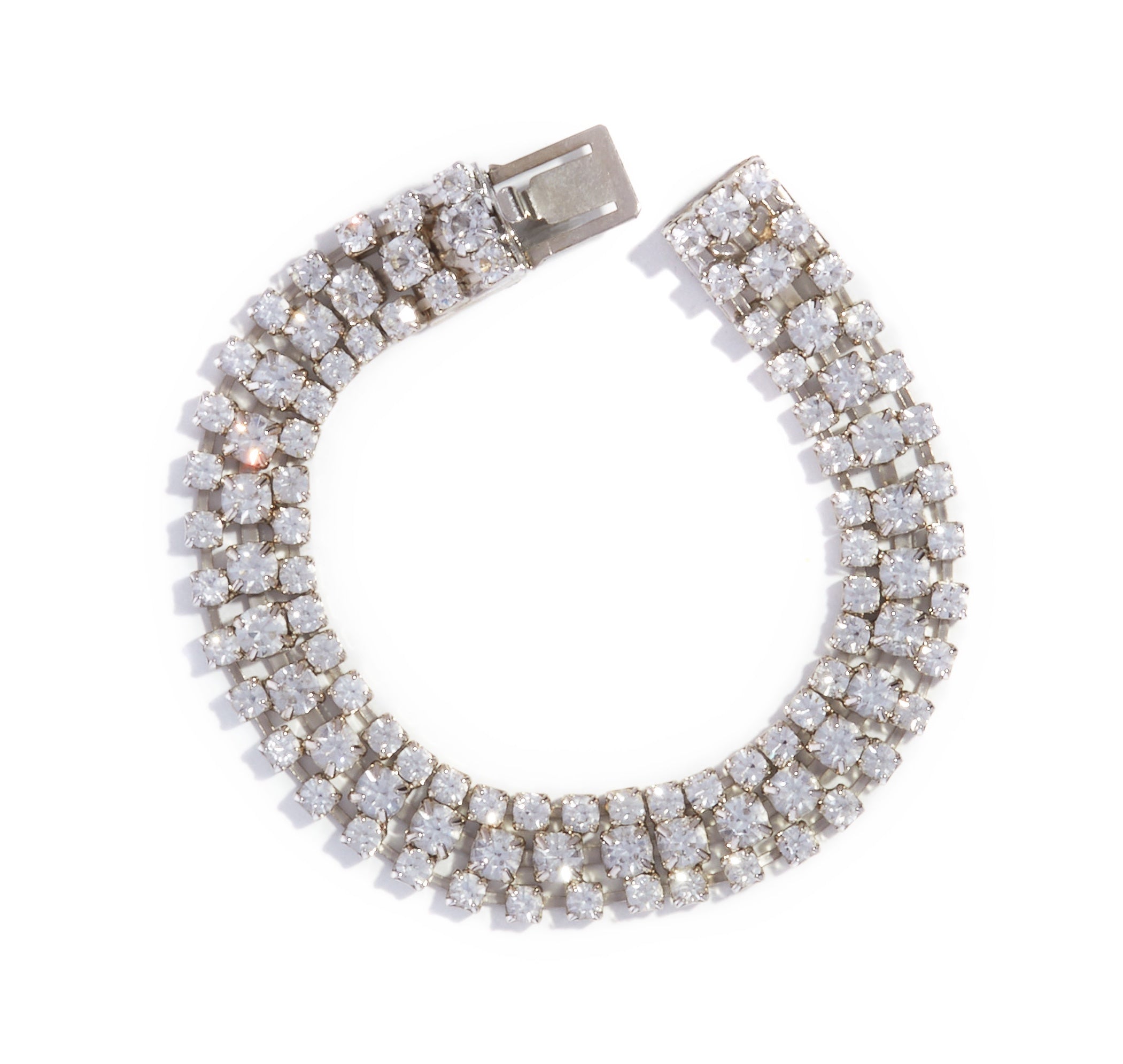 Bracciale di ottone cromato e strass a 3 fili. Anni ‘80 Made in Italy. Maglia ‘tennis’.