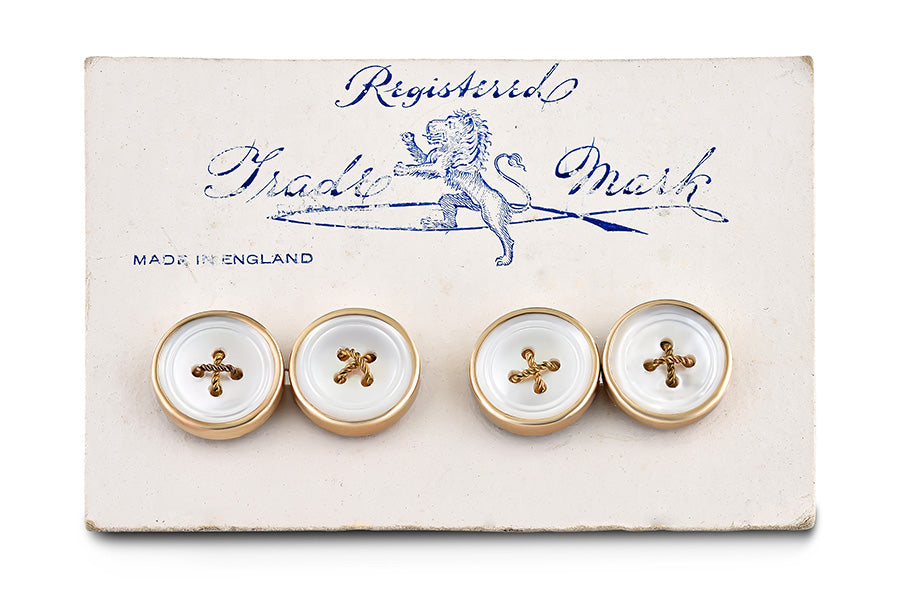 La particolarità è che si tratta di un paio di gemelli inglesi degli anni ’50, in metallo dorato, su espositore originale d’epoca.