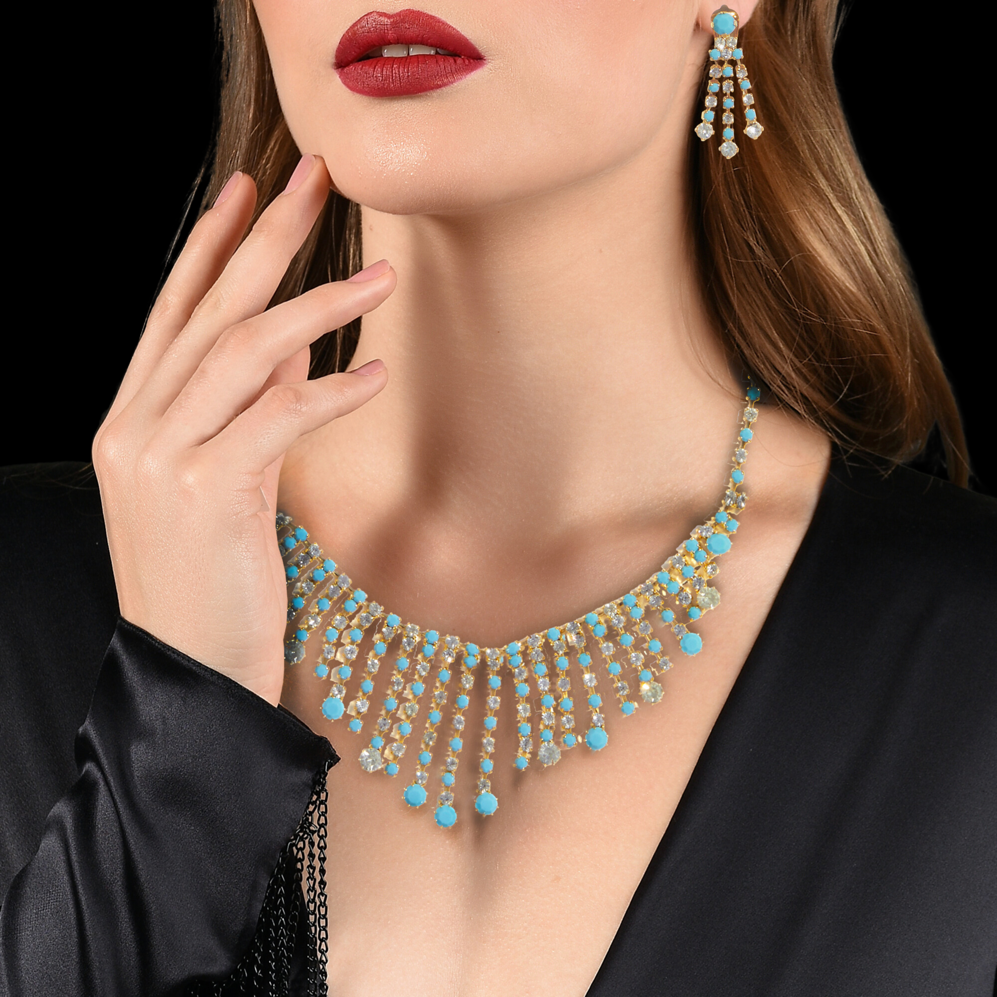 Parure anni ‘70 in ottone placcato oro con strass cristallo e turchese opaco, composta da collana girocollo, orecchini a clip e bracciale. Made in Italy