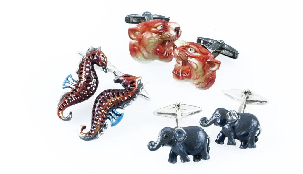 Nel nostro negozio proponiamo una vasta scelta di gemelli da polso moderni, in argento con smalti, che ritraggono cavallucci marini, tigri, elefanti e molti altri animali che possono esprimere al meglio le passioni e la personalità della persona che li riceverà.